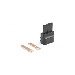 Dvoukolíkový silový konektor s plochými zlacenými kontakty se zatížitelností max. 50 A (dlohodobě 25A) s drážkovaným tělem pro pevnější uchopení.